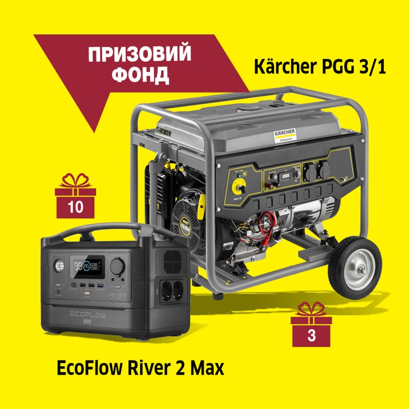 Розіграш 3 шт. бензинових генераторів Kärcher PGG 3/1 та 10 шт. зарядних станцій EcoFlow RIVER 2 Max серед покупців k-shop.com.ua.